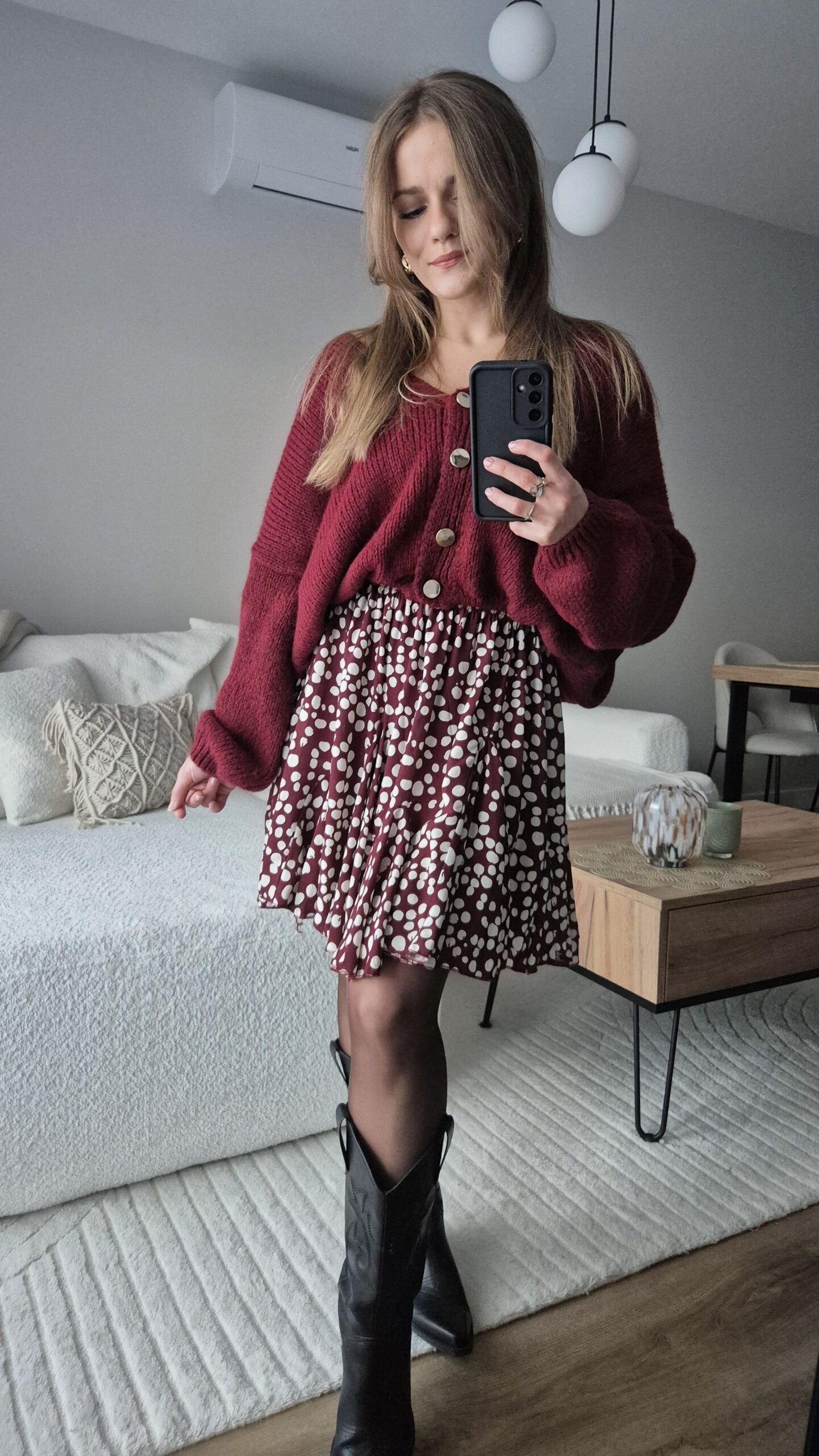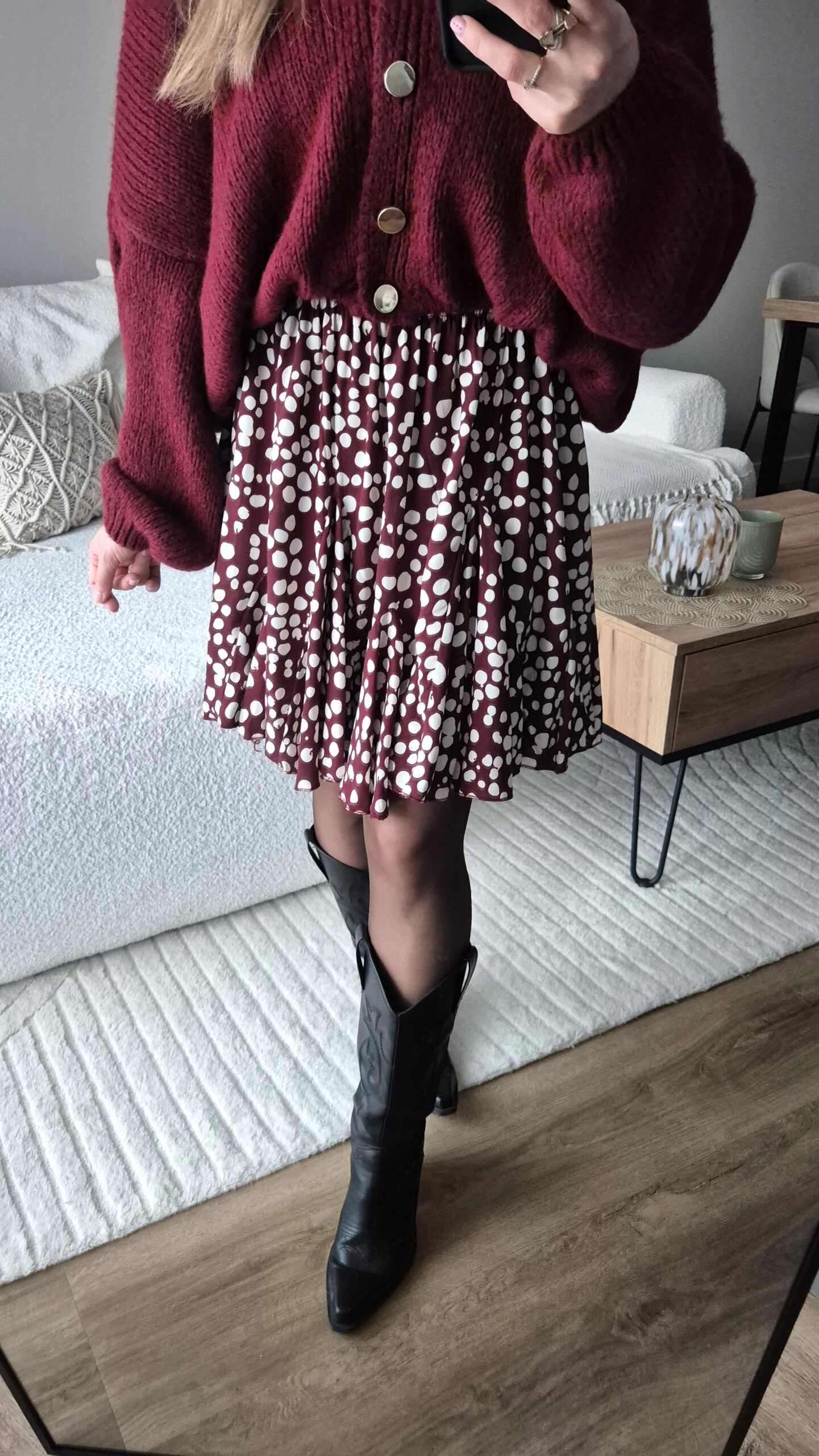 Spódniczka JUNE bordowa w beżowe kropki doda Twojej stylizacji dziewczęcego uroku dzięki falbankom. Spódniczka jest w rozmiarze uniwersalnym, a dzięki gumce w pasie świetnie sprawdzi się w rozmiarach od S do XL. Kolejnym jej atutem jest materiał – to aż 100% wiskoza. Spódniczkę możesz połączyć z ciepłym swetrem i wysokimi kozakami, by stworzyć niesamowitą i jednocześnie prostą stylizację.